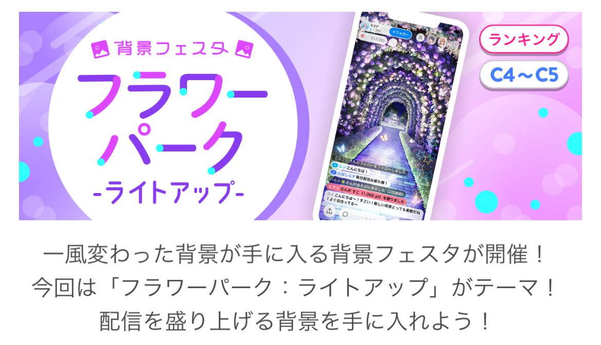 」がライブ配信アプリ「IRIAM」の公式イベント「背景フェスタフラワーパークライトアップ(C4~C5)」で1位入賞いたしました!