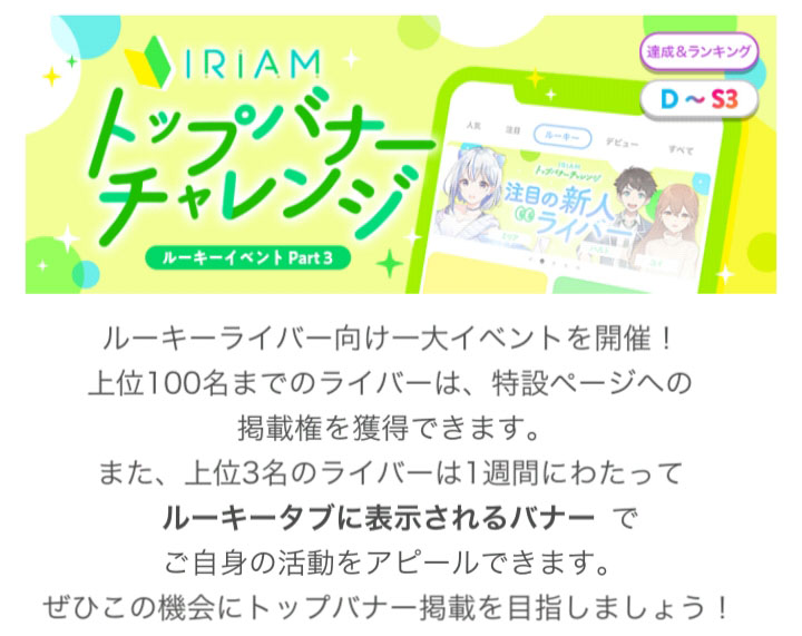 」がライブ配信アプリ「IRIAM」の公式イベント「トップバナーチャレンジ (9月3週)」で13位入賞いたしました!