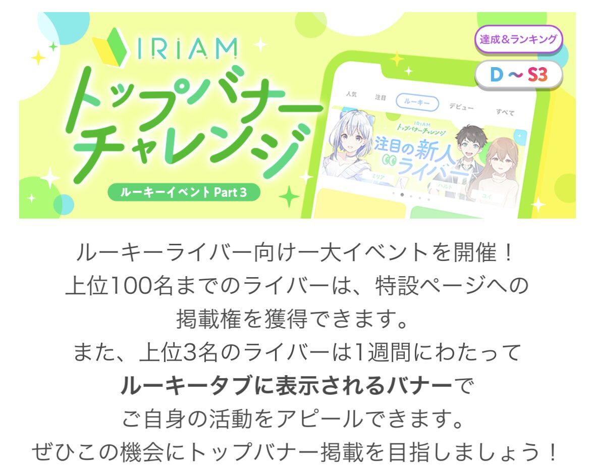 」がライブ配信アプリ「IRIAM」の公式イベント「トップバナーチャレンジ(10月4週)」で50位入賞いたしました!